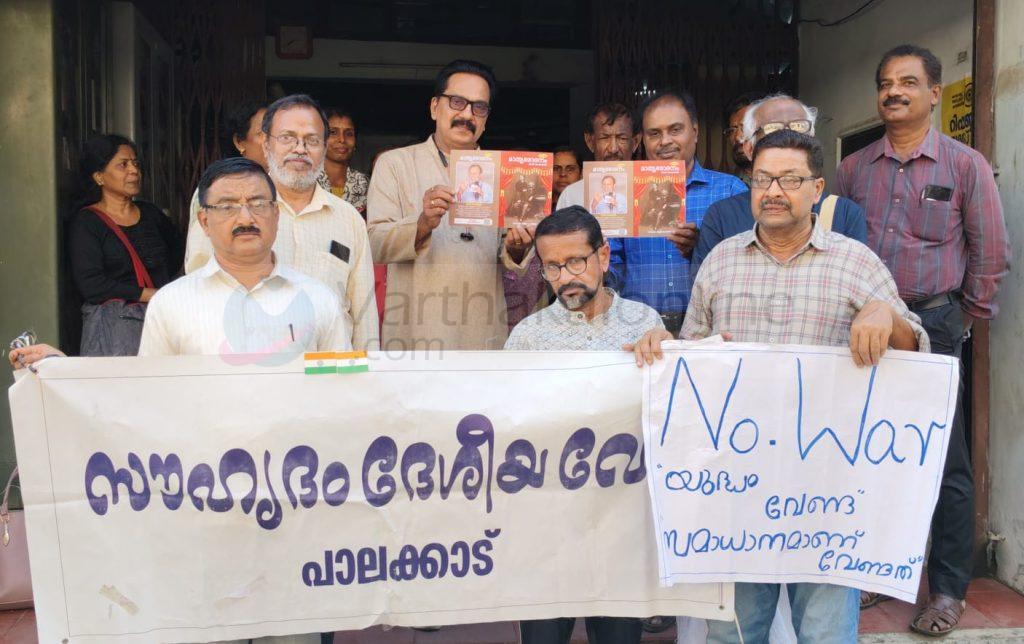 പാലക്കാട്: യുദ്ധം ലോകത്ത് ദുരന്തം വിതയ്ക്കുകയാണെന്നും അത് മാനവരാശിക്കും സമസ്ത ജീവജാലങ്ങൾക്കും ഭീഷണിയായി തീർന്നിരിക്കുകയാണെന്നും ഈ സാഹചര്യത്തിൽ യുദ്ധം ഉടൻ നിർത്തണമെന്നും ആവശ്യപ്പെട്ട് കലാസാഹിത്യ പ്രവർത്തകർ ഒറ്റക്കെട്ടായി രംഗത്ത് വന്നു. പാലക്കാട് സുൽത്താൻ പേട്ടയിലെ പബ്ലിക് ലൈബ്രറിയിൽ സൗഹൃദം ദേശീയ വേദിയുടെ ആഭിമുഖ്യത്തിൽ നടത്തിയ യുദ്ധ വിരുദ്ധ സംഗമത്തിലും രാഷ്ട്രപിതാവ് മഹാത്മാ ഗാന്ധിജിയുടെ ദണ്ഡി യാത്രാ അനുസ്മരണത്തിലും ഒത്തുചേർന്നാണ് ജില്ലയിലെ കലാ സാഹിത്യകാരൻമാർ യുദ്ധത്തിനെതിരായും സമാധാനത്തിന് വേണ്ടിയുമുള്ള വക്താക്കളായത്. അനേകം ജീവനുകൾ നഷ്ടപ്പെടുത്തുകയും, കുടുംബങ്ങളെ തകർക്കുകയും, അടിസ്ഥാന സൗകര്യങ്ങൾ നശിപ്പിച്ച് ദാരിദ്ര്യവും പട്ടിണിയും വർദ്ധിപ്പിക്കുകയും ചെയ്യുന്ന യുദ്ധത്തിനെതിരേയുള്ള മാനവിക ഐക്യത്തെ അവർ ഉദ്ബോധിപ്പിച്ചു. സമാധാനവും ഐക്യവും തകർക്കുന്ന യുദ്ധം ജനങ്ങളിൽ ഭയവും വെറുപ്പും വളർത്തുകയും തലമുറകളോളം നീളുന്ന മാനസിക ആഘാതങ്ങൾ ഏൽപ്പിക്കുകയും ചെയ്യുന്നു.